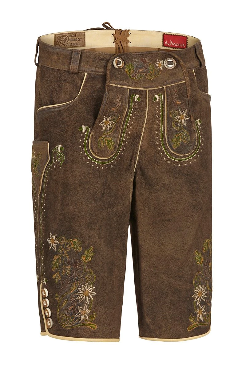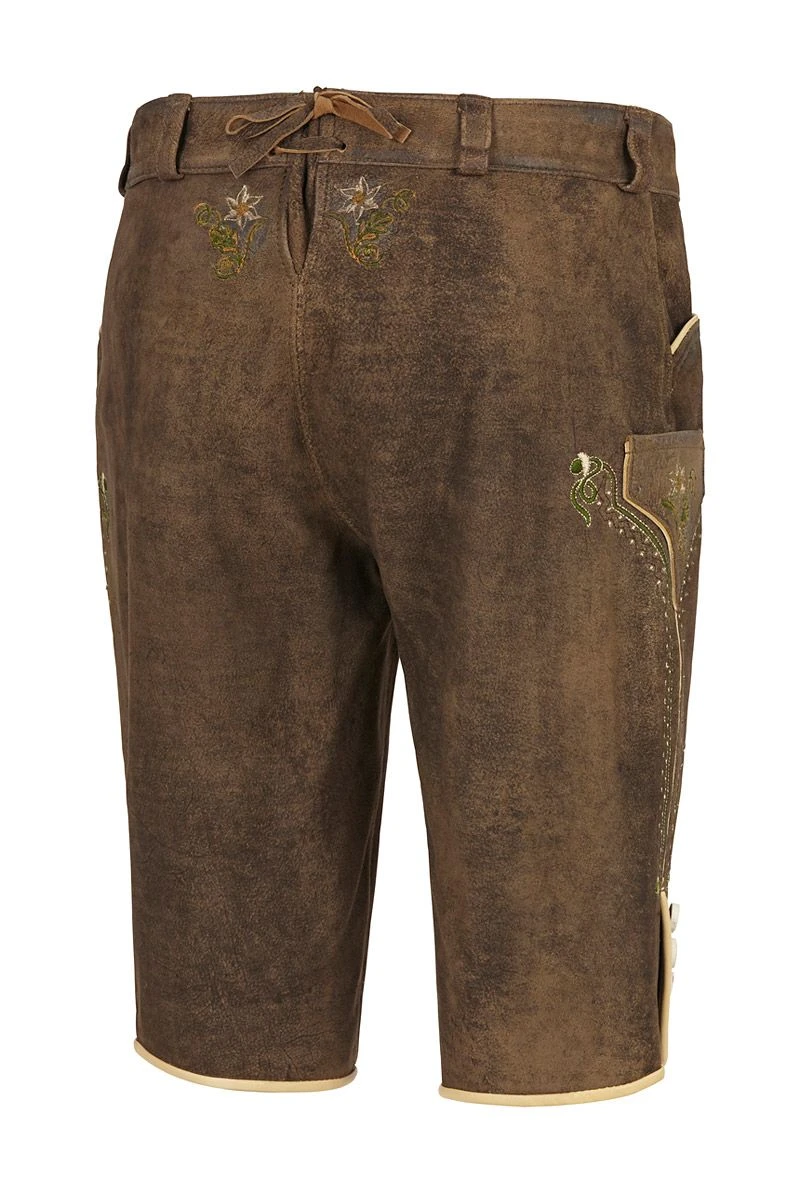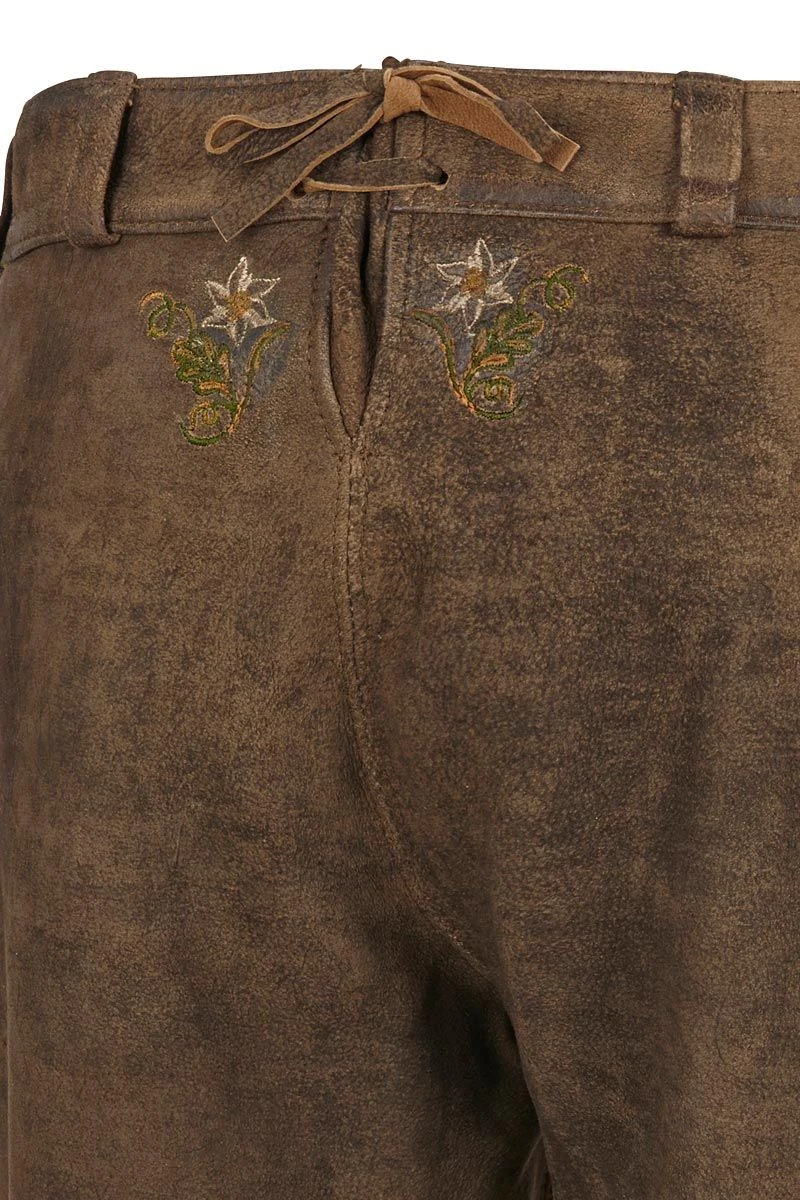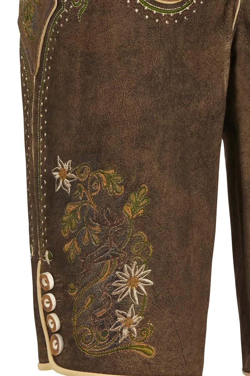 Eine Lederhose für Damen, die Tradition mit Liebe zum Detail verbindet, soll es sein? Dann ist die braune Lederhose perfekt! Auf weichem Leder tummeln sich traditionelle Stickereien, die uns an Alpenwiesen und Berggräser erinnern. Der Hosenlatz, die Knöpfe in Hirschhornoptik und die Messertasche sind weitere Details, die Lust machen, sich die Bergstiefel anzuziehen und sich ein Plätzchen auf der Almhütte zu suchen! Also, worauf noch warten? Lederhose schnappen und ab ins Grüne!