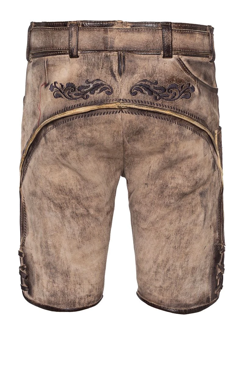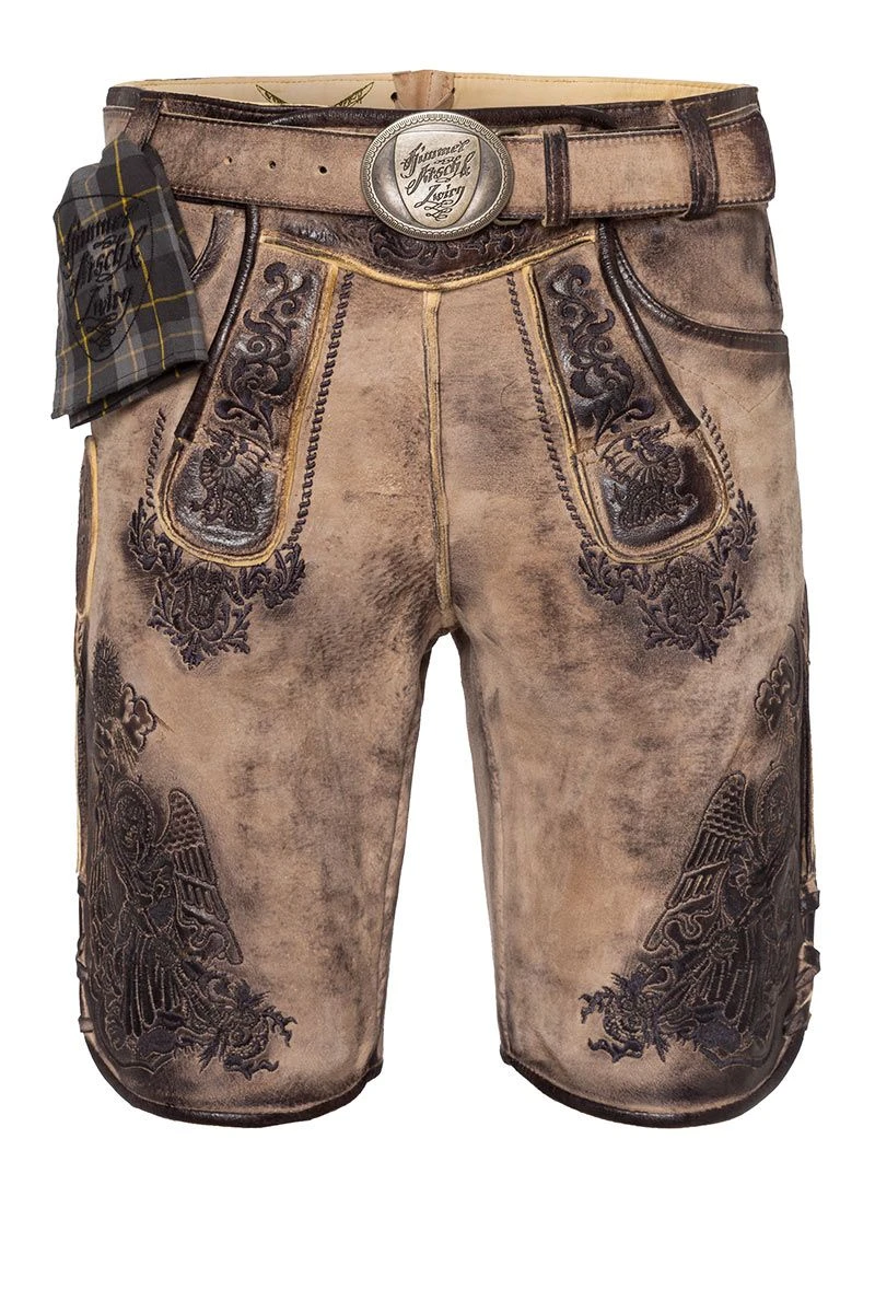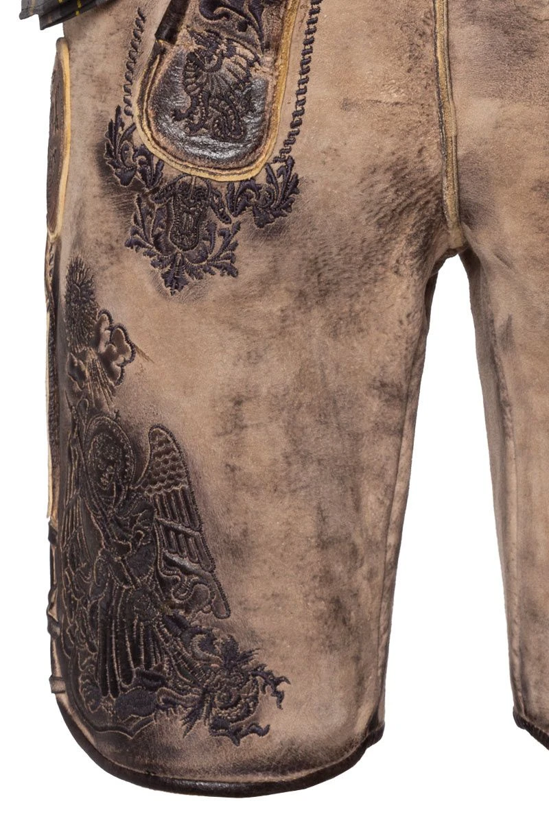 Produktbeschreibung Himmel, Arsch und Zwirn Lederhose kurz hellbraun antik mit Gürtel St. Virtus