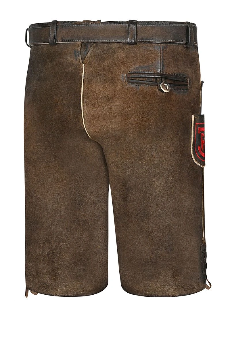 Produktbeschreibung MOSER Lederhose kurz mit Gürtel braun rot bestickt SSV Jahn Regensburg