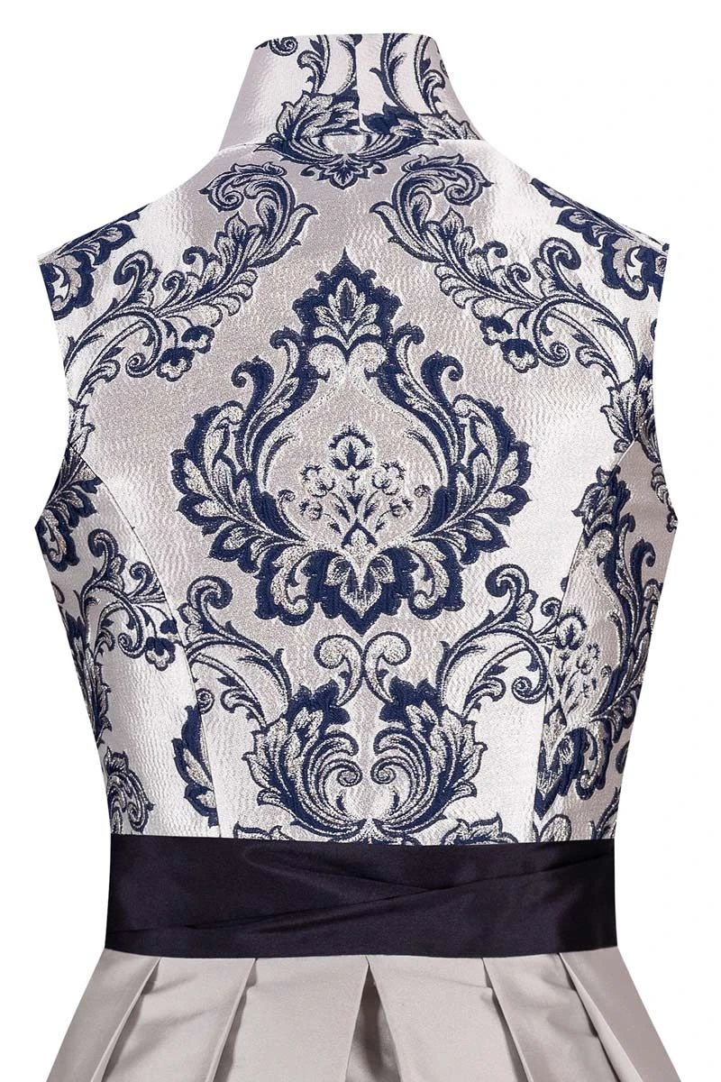 Dirndl Königselfe macht seinem Namen alle Ehre! Edler, silber schimmernder Brokatstoff trifft auf royales Dunkelblau. Das glamourös gemusterte Mieder sorgt mit silber glitzernden Akzenten für Furore. Die blaue Dirndlschürze aus zarter Blumenspitze mit funkelnden Metallic-Perlen und elegantem Taft-Band rundet den königlichen Look ab.