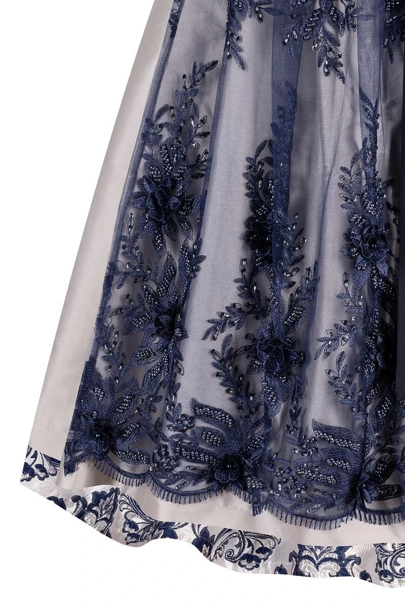 - dunkelblaue, perlenbesetzte Tüllschürze mit feinen Blumenstickereien