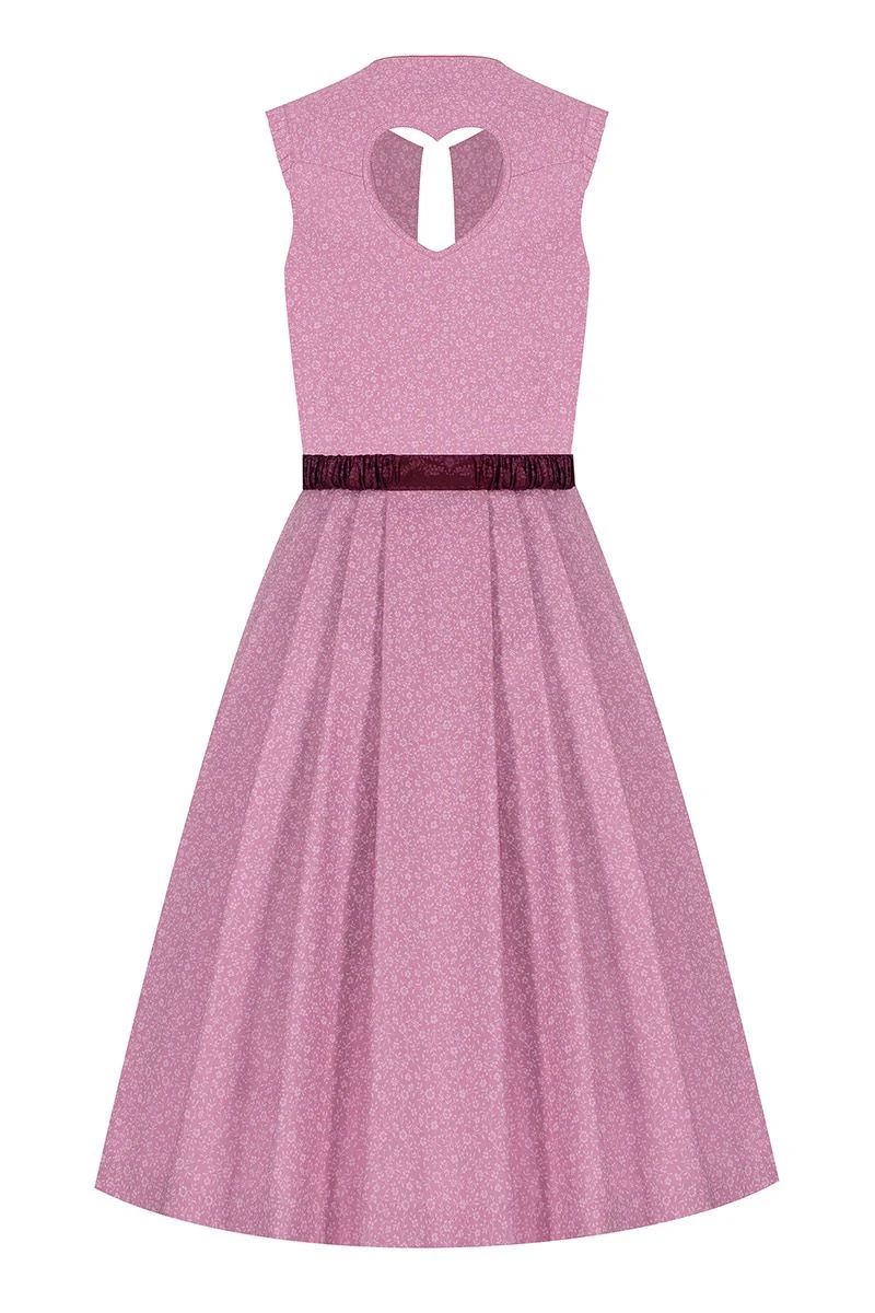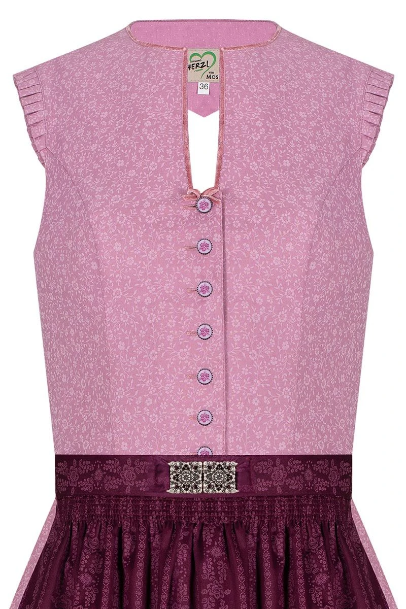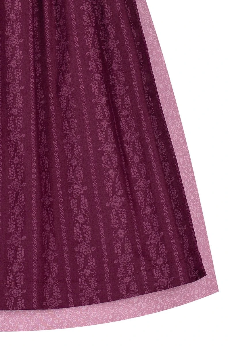 Produktbeschreibung Artmann’s Herzl Midi Dirndl 65er altrosa beere gemustert Melina – limitiert