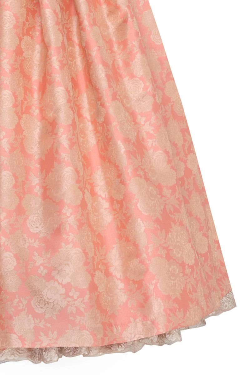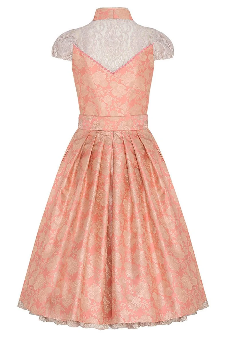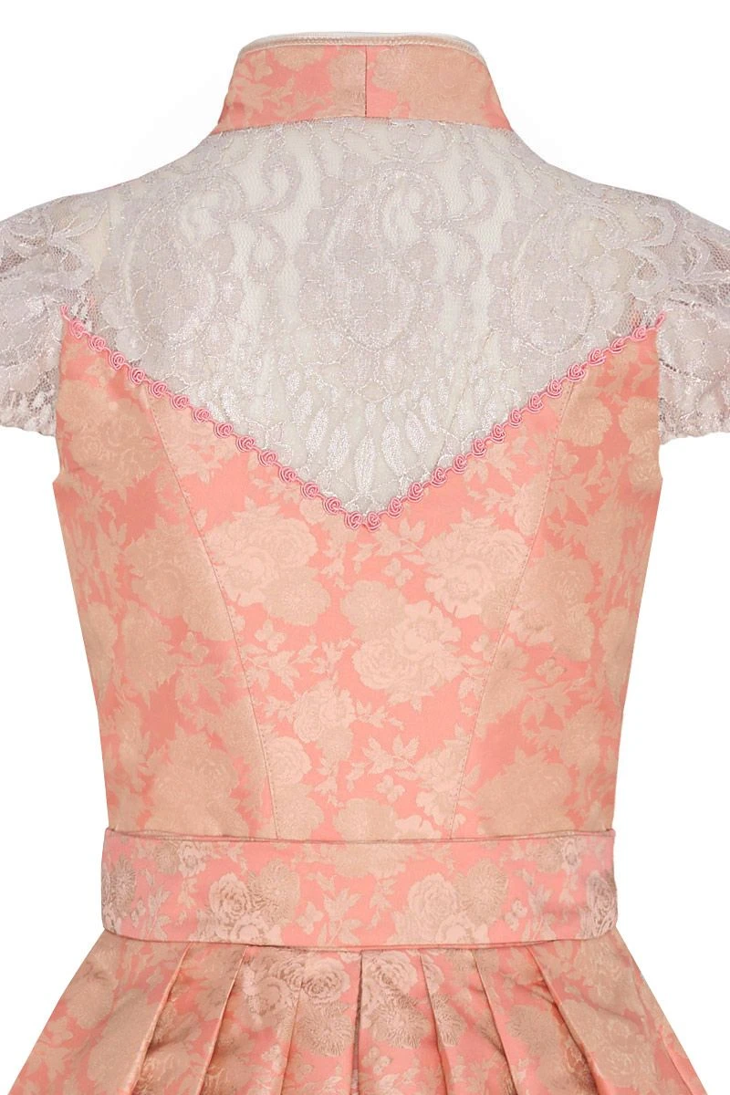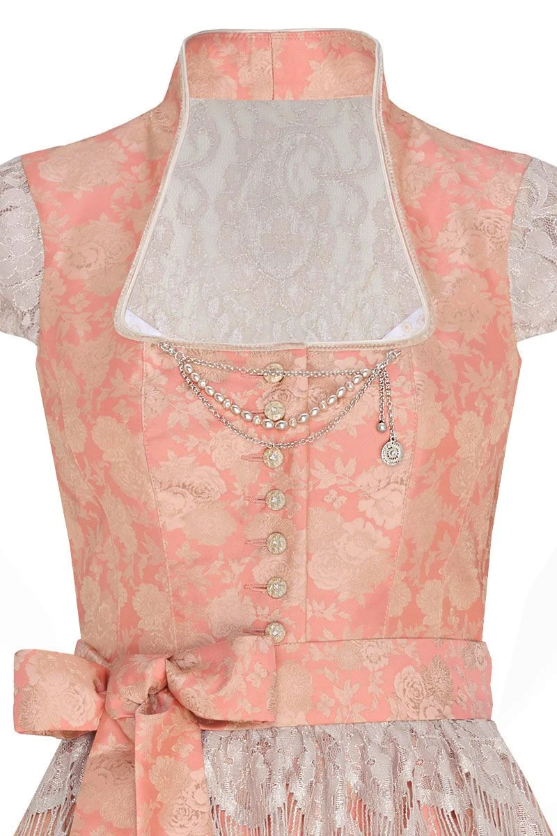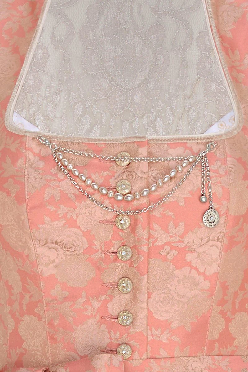 Bei unserem Dirndl Patrizia folgt ein Highlight auf das nächste! Pure Eleganz entsteht durch den fein glänzenden, apricotfarbenen Stoff, der mit einem Muster aus prächtigen Rosenblüten verziert ist. Der obere Rücken ist wie auch die Flügelärmelchen aus zarter, glitzernder Spitze gefertigt und sorgt auch auf der Rückseite für einen tollen Eyecatcher. Ein perlenbesetztes Charivari und goldene Knöpfe setzen das Mieder gekonnt in Szene. Dank eines abnehmbaren Petticoats mit Spitzensaum kannst Du das Volumen des Rockes ganz einfach variieren. Auch wenn Du auf der Suche nach einem Brautdirndl bist, ist Dirndl Patrizia ein echter Geheimtipp!