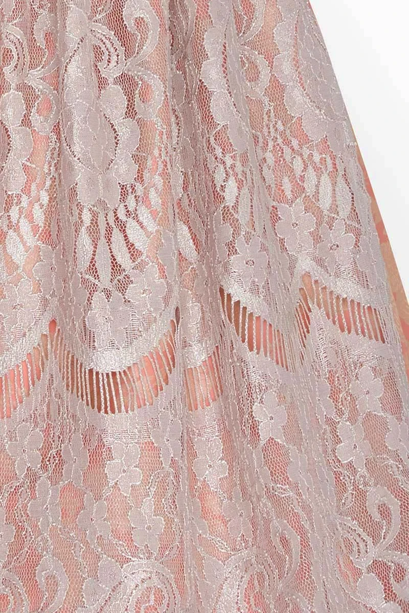 - Ärmel und Schürze aus taupefarbener Blumenspitze
