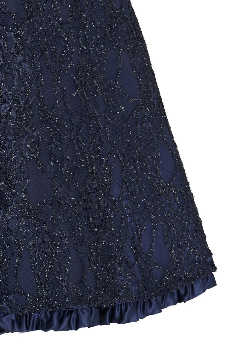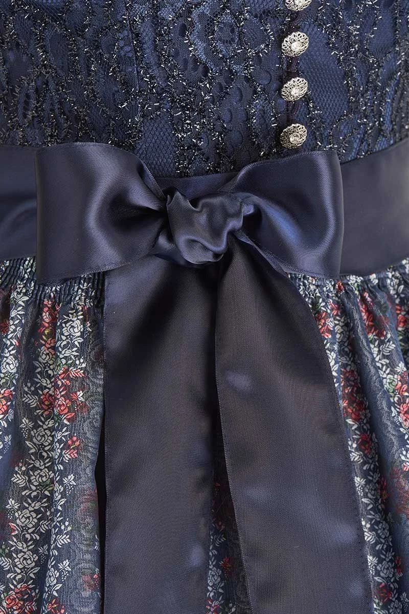 - Dirndl in 70er Länge aus dunkelblauem Satin mit glitzernder Blumenspitze