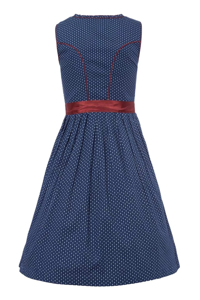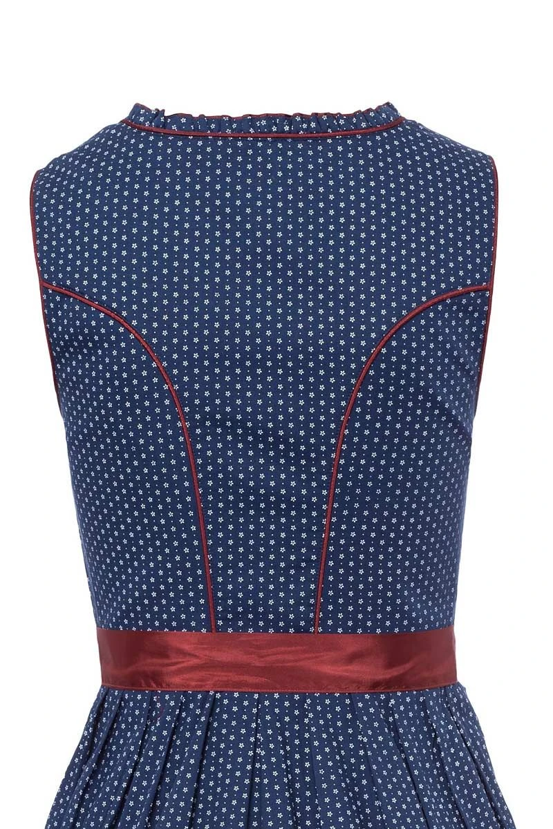 Fesche Madln setzen auf das 55er Dirndl ‚Maralda‘ aus dem Hause Marjo. Für den authentischen Trachten-Look ist das dunkelblaue Baumwollkleid mit einem weißen Streublumenmuster bedruckt. Der vorgeformte Miederausschnitt ist mit einer Rüschenkante verziert und die Vorderseite tritt durch einen harmonischen Bortenmix inklusive Charivari in Erscheinung. Satinbandschnürung und herzförmige Miederhaken komplettieren das ausdrucksstarke Design dieses feschen Kleids für stilechte Auftritte im Alltag oder im Festzelt. ‚Maralda‘ aus dem Hause Marjo ist klasse Dirndl-Fashion!