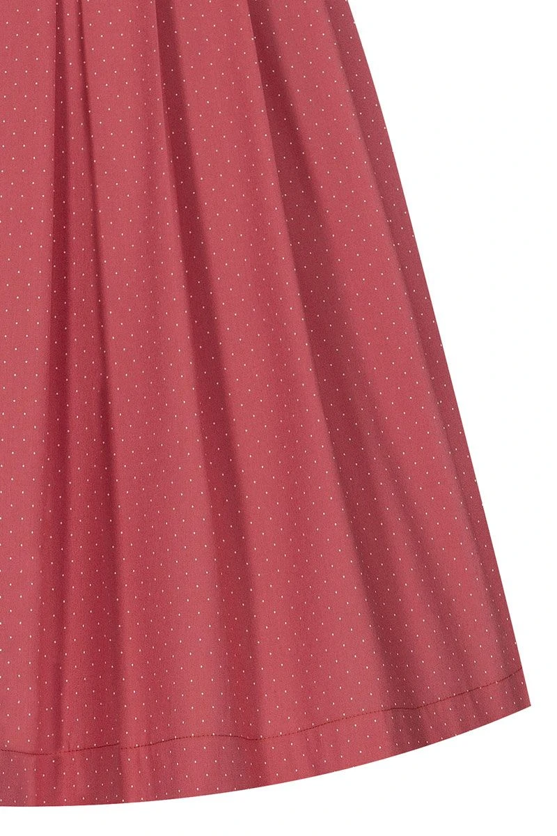Das Dirndl Bethany ist ein echter Volltreffer in Sachen Retro! Angefangen bei der hochgeschlossenen Form des Dirndls bezaubert der in Rüschen gefasste V-Ausschnitt mit einer Zierborte, die das Creme der prächtig verzierten Blumenschürze aufgreift. Das korallefarbene Baumwollkleid ist mit kleinen Pünktchen bedruckt und wird vorne mit altsilbernen Knöpfen geschlossen. Die hübsch verzierte Schürzenbrosche ist ein weiteres Schmuckstück dieses feschen Dirndls. Ein tolles Wiesn-Outfit!