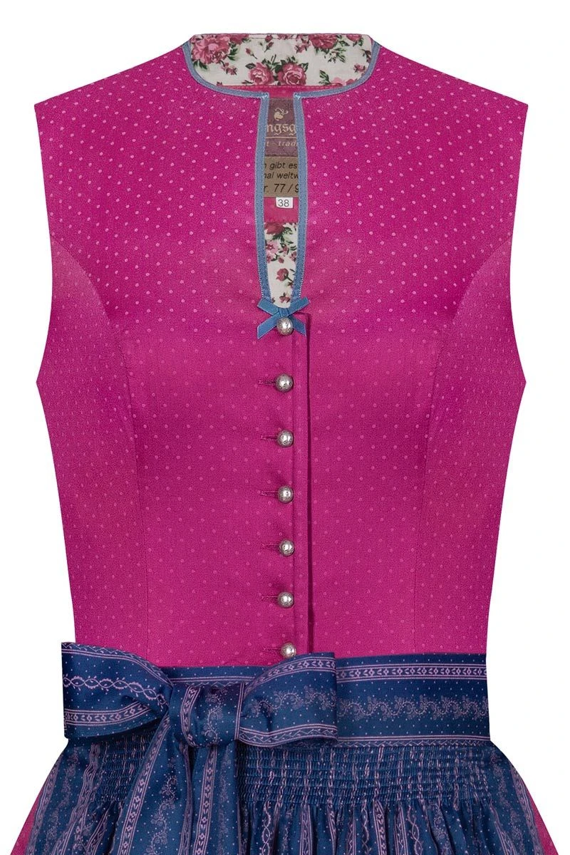 Ein absoluter Hingucker ist unser pinkfarbenes Mini Dirndl Emilia von Lieblingsgwand! Der süße Retro-Look des traditionell geschnittenen Dirndls kommt durch den gepunkteten Baumwollstoff und die klassisch gemusterte Schürze mit kleinen Pünktchen toll zum Vorschein. Ein hübsches Detail ist das kleine Schleifchen aus blauem Satin über der Knopfleiste, das mit der darüber liegenden Satinborte die Retro-Form dieses Dirndls schön betont. Nur 99 Stück dieses exklusiven Dirndls sind weltweit verfügbar!