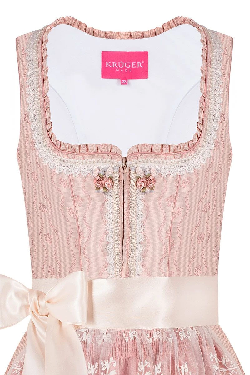 Produktbeschreibung Krüger Mini Dirndl 60er rosa gemustert mit cremefarbener Tüllschürze Rosanna