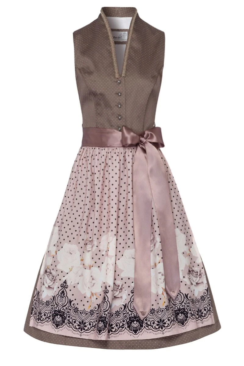 Für die wahren Retro-Fans haben wir ein echtes Schmuckstück parat: das Dirndl Borina von MarJo! Der taupefarbene Stoff des Dirndls ist mit kleinen weißen Tupfen übersät und am V-Stehkragen mit zwei prächtigen Bordüren besetzt: einer taupefarbenen Kordelbordüre, die sich in kleinen Schnörkeln um den eleganten Kragen legt, und mit einer metallisch glänzenden Borte aus kleinen Zierperlen. Das Mieder wird mit altsilbernen Knöpfen geschlossen, die die Form einer Rosenblüte haben und in deren Mitte ein kleiner Strassstein funkelt. Der Vintage-Look setzt sich auch auf der cremefarbenen Schürze mit leichtem Rosa-Anteil durch, denn auch sie ist mit großen, schwarzen Punkten versehen. Ein toller Hingucker sind die cremefarbenen Rosenblüten und die schwarze Ornamentborte im unteren Bereich der Schürze. Ganz bezaubernd!