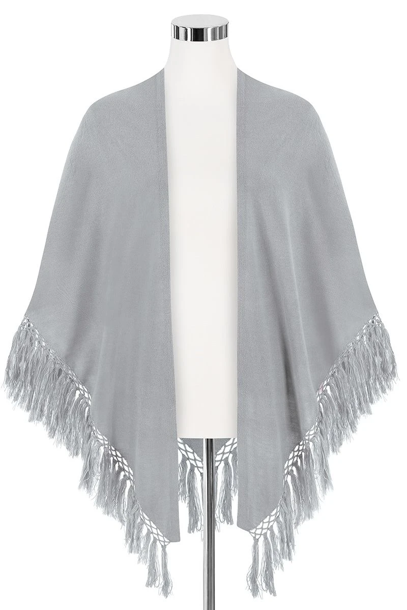 - grauer Poncho aus Feinstrick mit Fransenabschluss