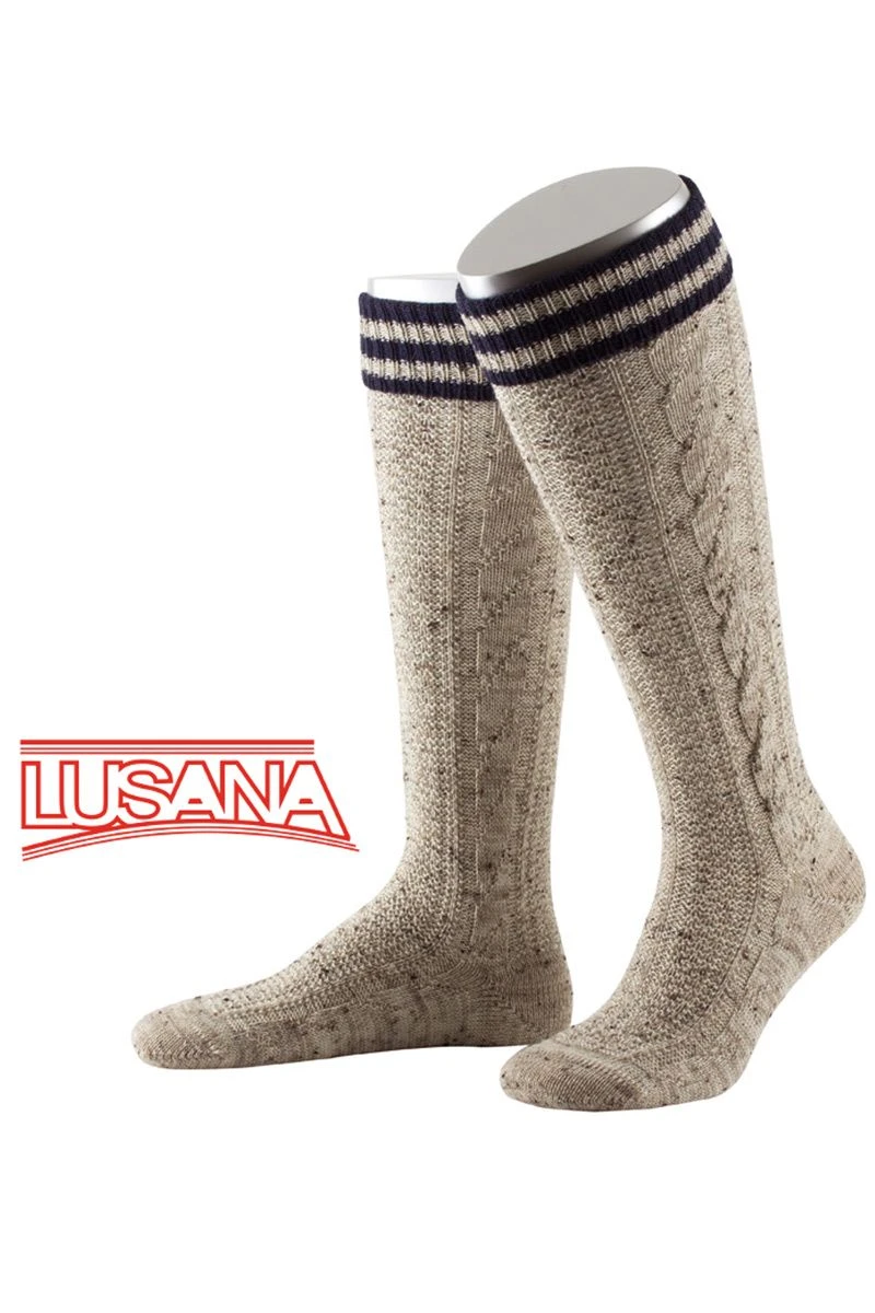 Produktbeschreibung Lusana Trachten Kniestrümpfe hellbraun blau Merinowolle