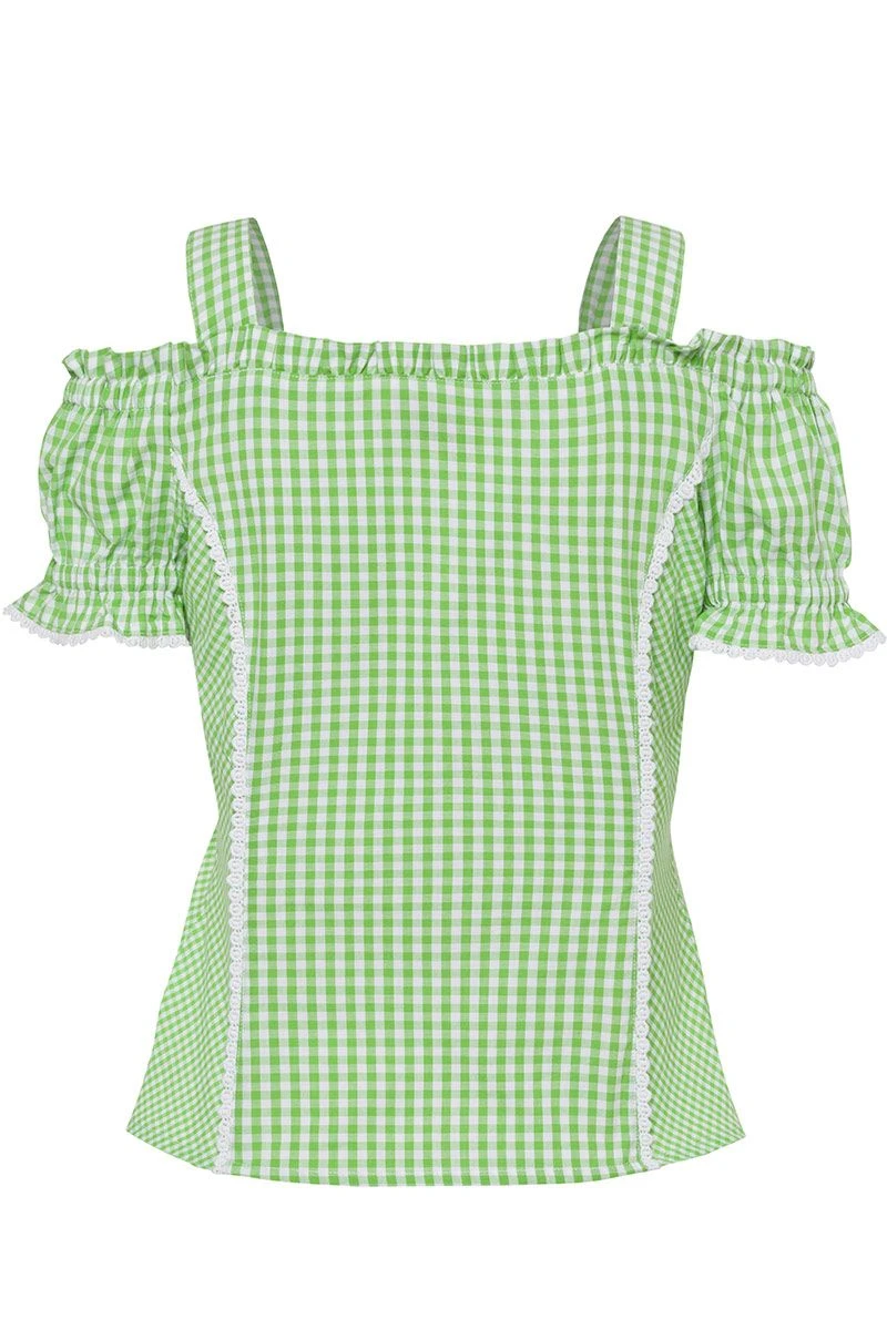 Produktbeschreibung Country Lady Trachtenbluse kurzarm hellgrün kariert mit Carmenärmeln