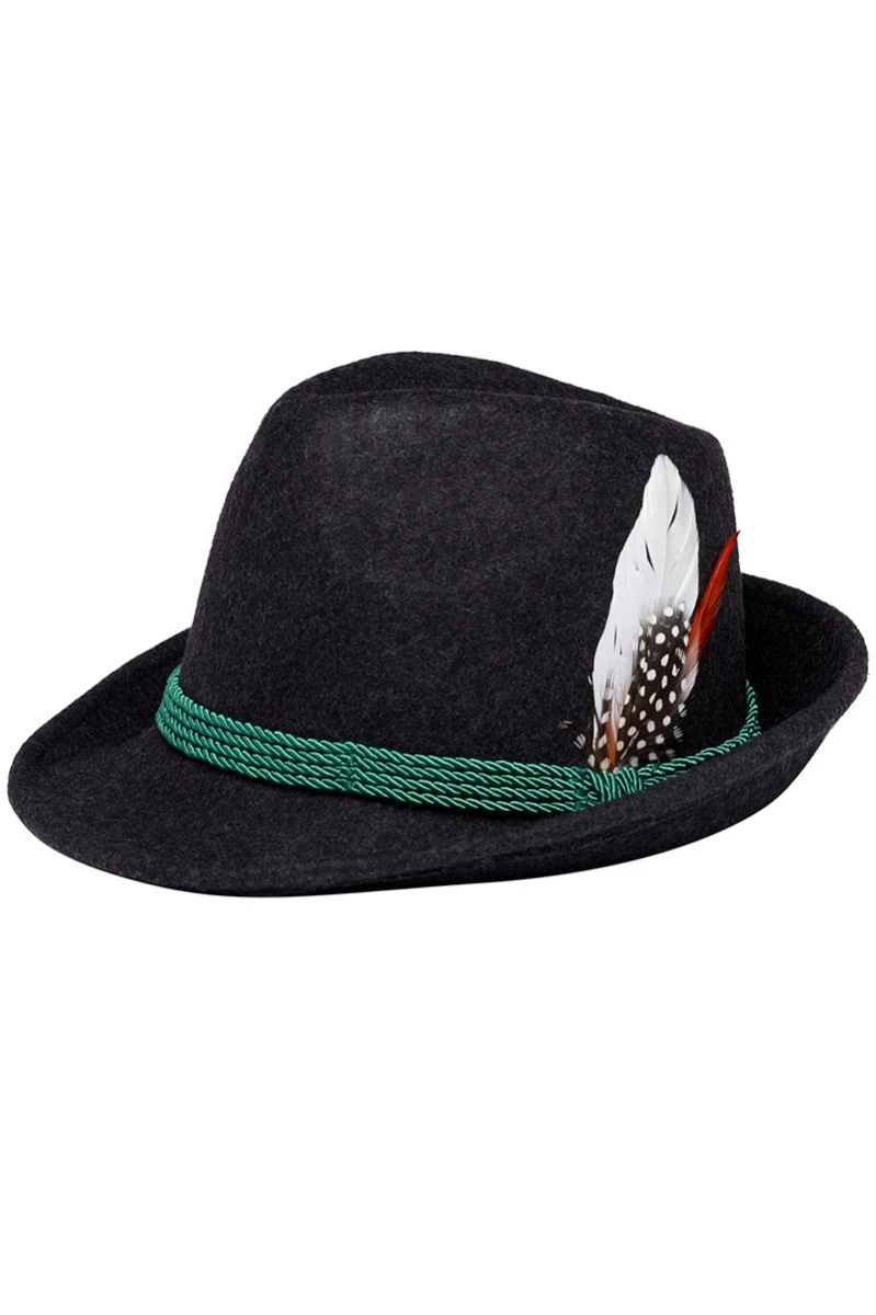 Anthrazitfarbener Hut mit dunkelgrünen Kordeln und Feder.