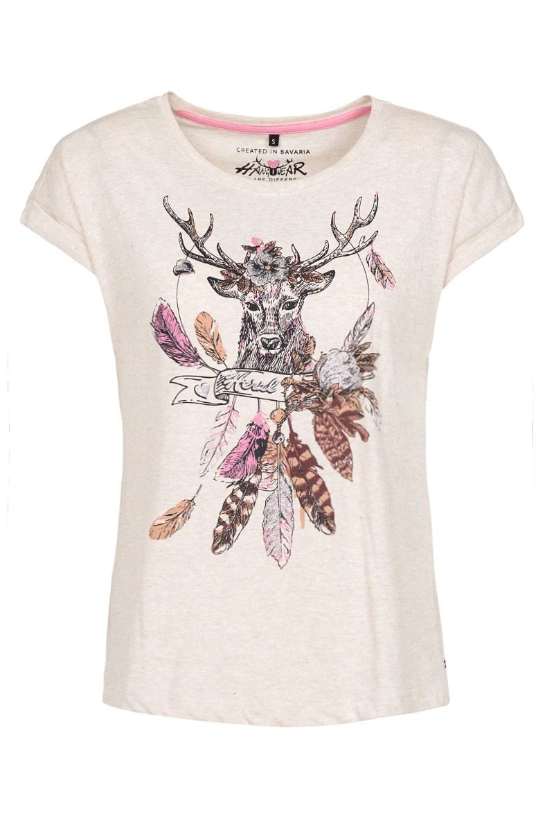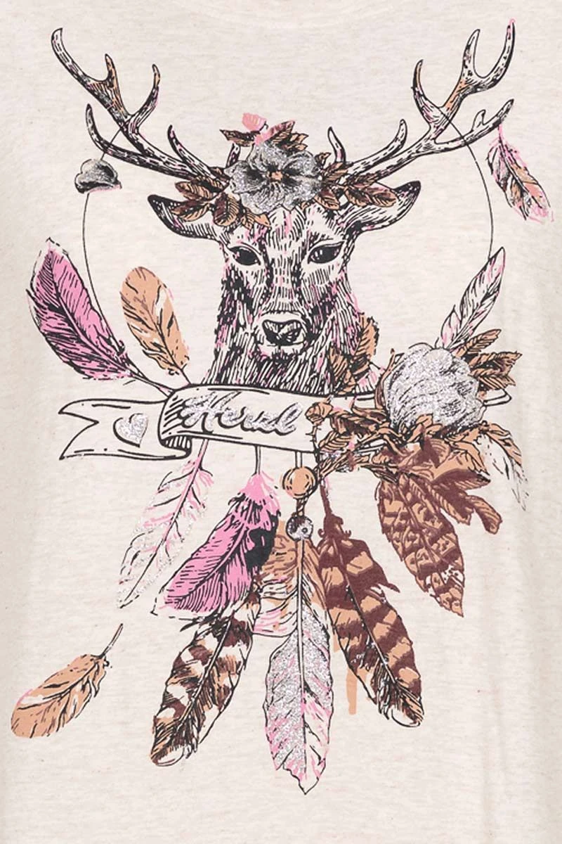 - aufgedrucktes Hirschmotiv mit Glitzerdetails, Federn, Blumen und ‚Herzl‘-Schriftzug