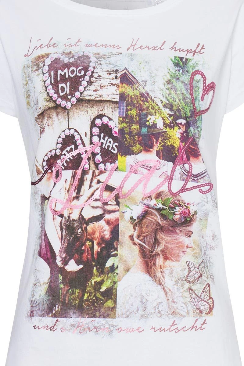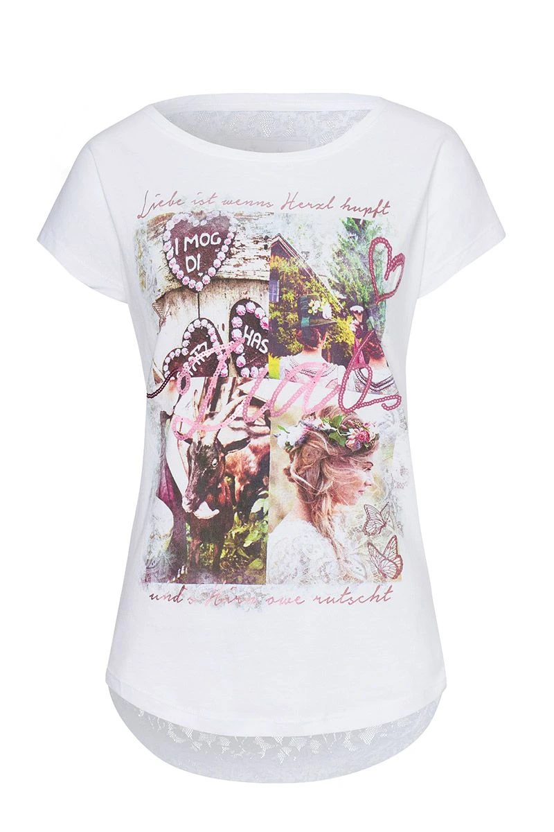 Produktbeschreibung hangOwear Trachtenshirt kurzarm weiß mit Spitze und großem Aufdruck Iska
